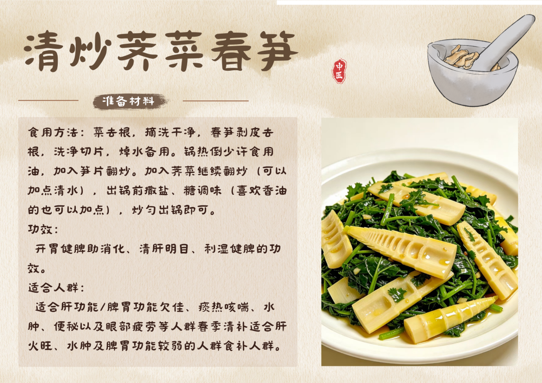 • 荠菜/春笋清炒:清轻升发,顺应春气