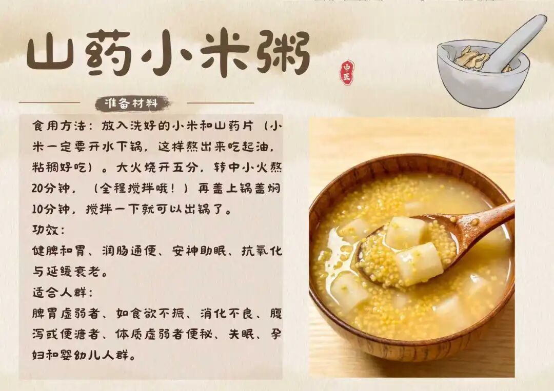 • 健脾祛湿:山药、茯苓、薏米、白扁豆、小米
