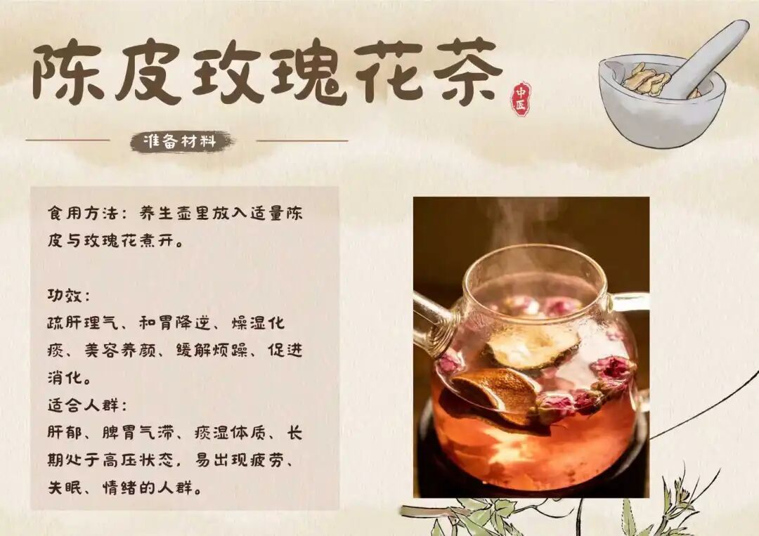 • 玫瑰花+陈皮泡水:疏肝理气、缓解烦躁