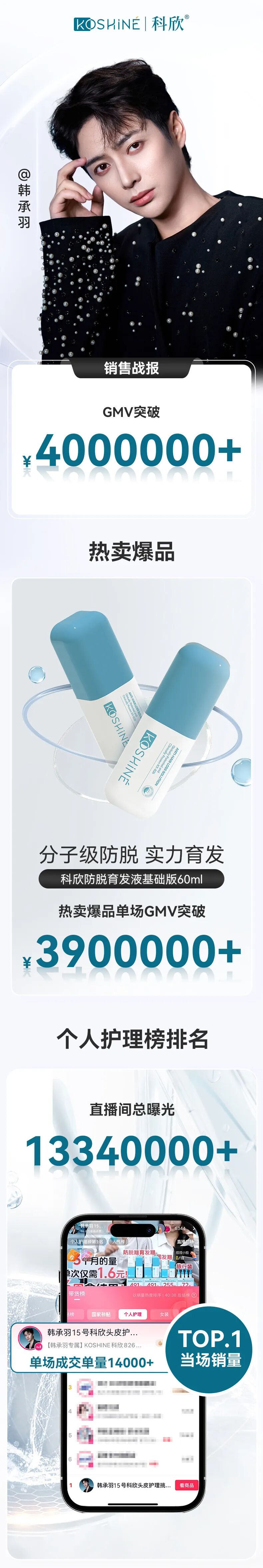 北京时间2025年10月15日,开拓药业(股票代码:9939.HK),宣布其KOSHINE科欣再次携手知名达人@韩承羽斩获佳绩,总GMV超400万正规炒股配资,再次霸榜个人护理榜单TOP1!直播间销量节节高升,总曝光量破千万。
